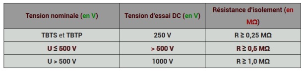 Le tableau donne les tensions de test recommandées en fonction des tensions de service des installations et équipements (issu du guide IEEE 43).